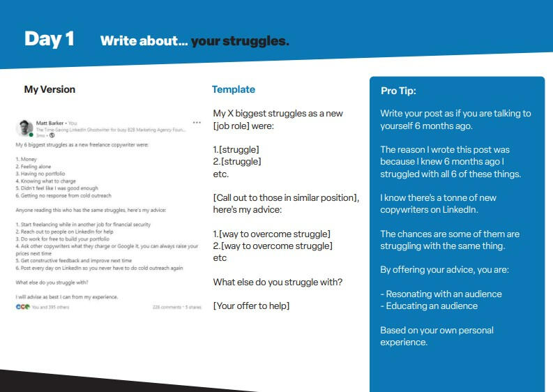 30 Days of Proven LinkedIn Content is an instantly actionable pack of 30 templates & tips.Start writing highly engaging content in half the time, without losing your personal touch.